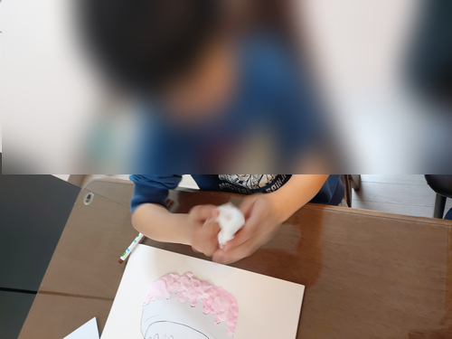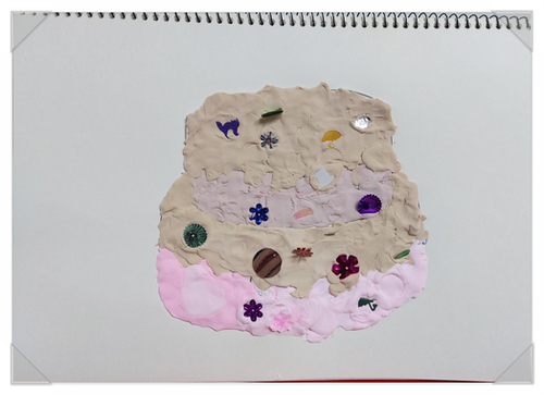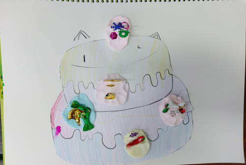 ④ 색을 입힌 점토를 케이크 모양에 맞춰서 붙인다.
