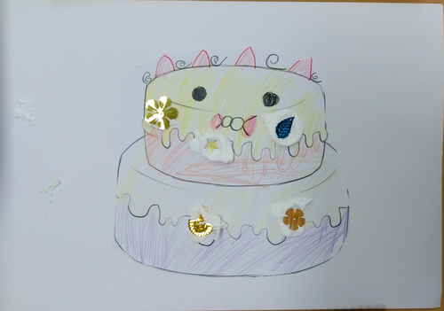 ① 케이크 모양 본을 오려서 도화지에 붙인다.